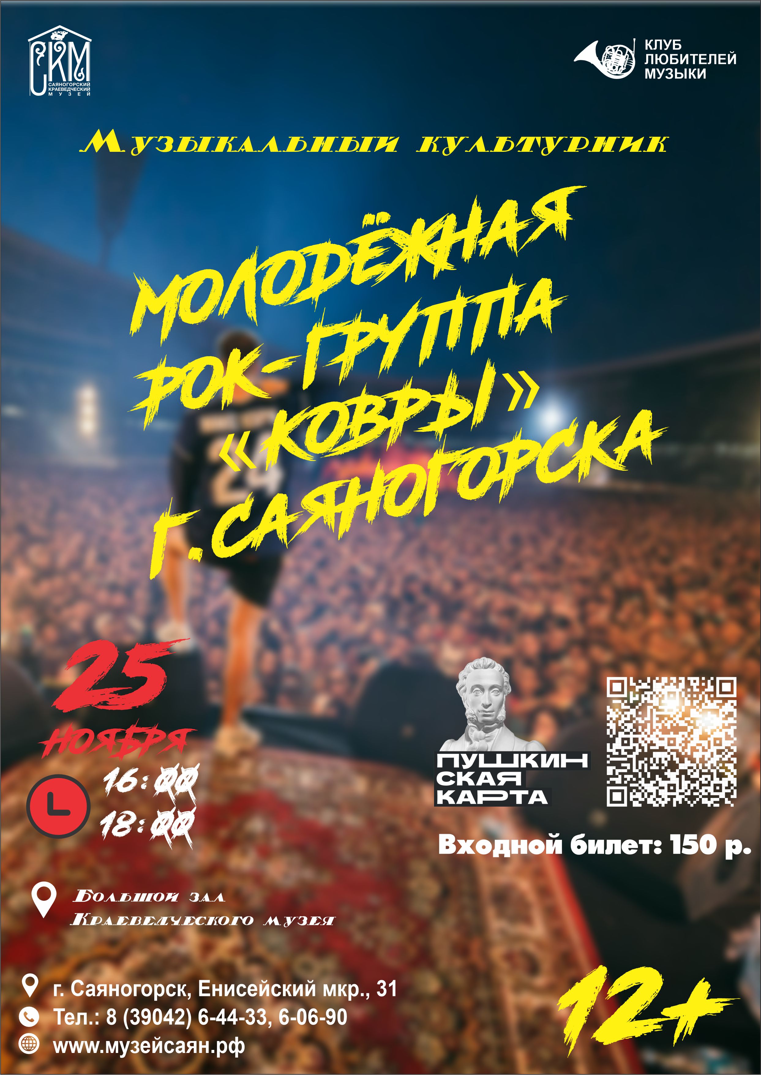 Проведи холодный осенний день в компании друзей и отличной музыки от участников группы "Ковры". 25 ноября ждём всех желающих на музыкальном культурнике в рамках "Клуба любителей музыки" Большой зал "Краеведческого музея" Начало в 16:00 Стоимость билета: 150 р. ... Читать дальше » |
